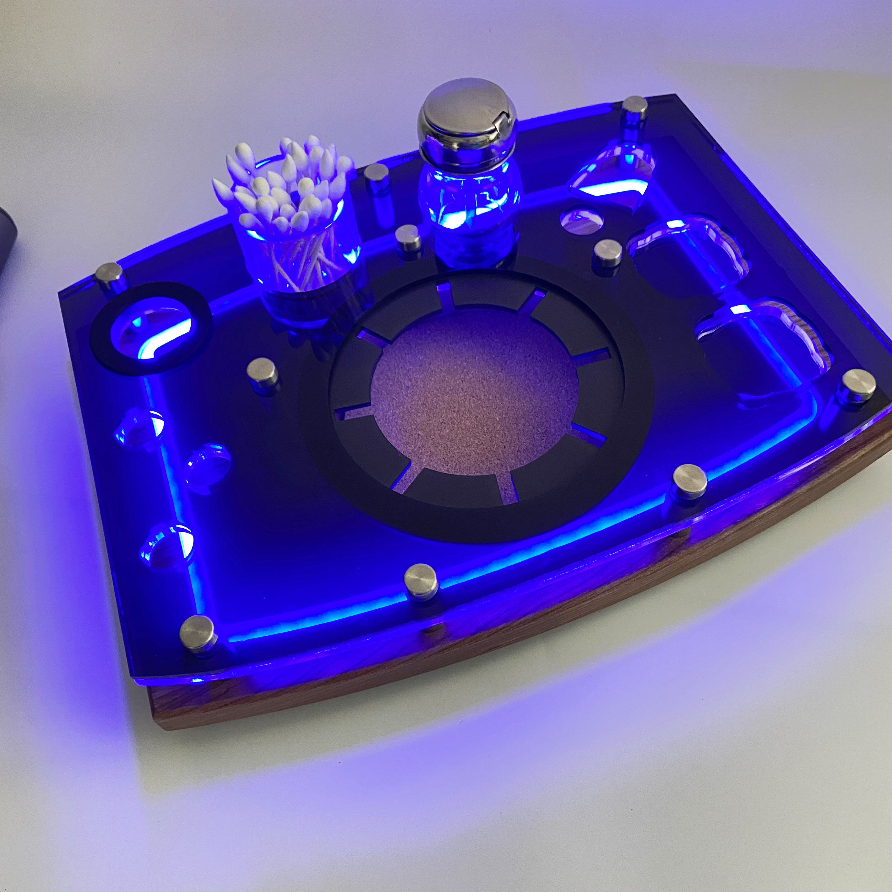 This organizer tray for your Freeze Pipe will enhance your session and store your expensive glass pieces when not in use. The LED light strip embedded in the base of the tray is powered by an external power bank that snaps to the bottom of the tray with magnets and remains hidden. The LED power button is on the end of the tray. We include cleaning accessories to make tidying up easy. Check the color chart and LED color photos to see what other colors are available. Add a note to your order to let us know if you want another color setup.